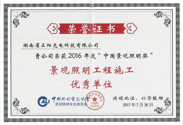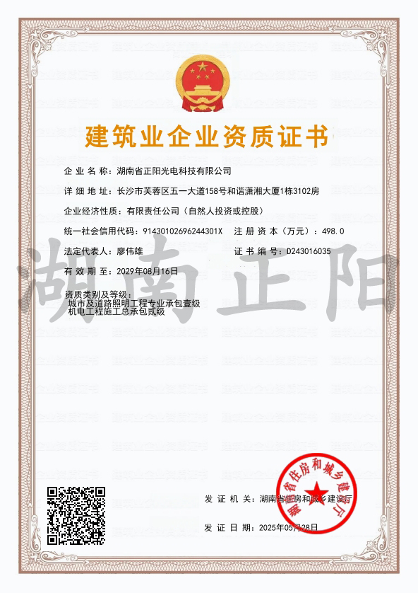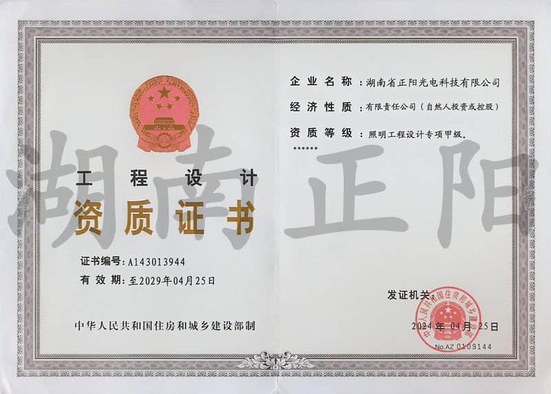 湖南省正陽(yáng)光電科技有限公司是一家從事亮化工程及大型燈光藝術(shù)的設(shè)計(jì)、制作、安裝和維護(hù)于一體的專(zhuān)業(yè)化公司。公司資質(zhì)齊全、管理嚴(yán)謹(jǐn)、技術(shù)先進(jìn)、實(shí)力雄厚,取得了城市及道路照明工程專(zhuān)業(yè)承包壹級(jí)資質(zhì)、照明工程設(shè)計(jì)專(zhuān)項(xiàng)甲級(jí)資質(zhì)、機(jī)電工程施工總承包貳級(jí)資質(zhì)、施工勞務(wù)等資質(zhì),榮獲“重質(zhì)量·守誠(chéng)信”示范企業(yè)。