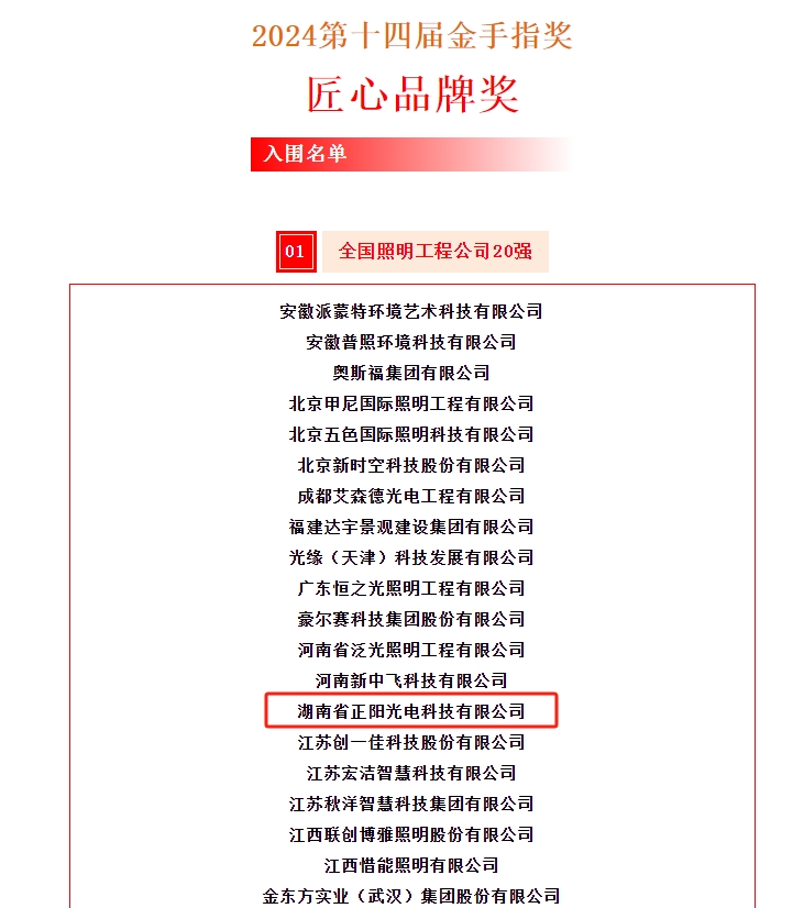 中國照明行業(yè)2024第十四屆金手指獎全國評選大賽圓滿結(jié)束,湖南省正陽光電科技有限公司被評為匠心品牌獎“全國照明工程公司20強”。