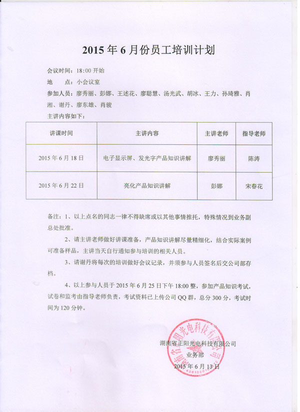 2015年6月22日,公司組織新員工在公司小會議室參加亮化產(chǎn)品知識的學(xué)習(xí)培訓(xùn)。主講老師是電子商務(wù)部彭娜同志,指導(dǎo)老師是總經(jīng)辦宋春花同志。