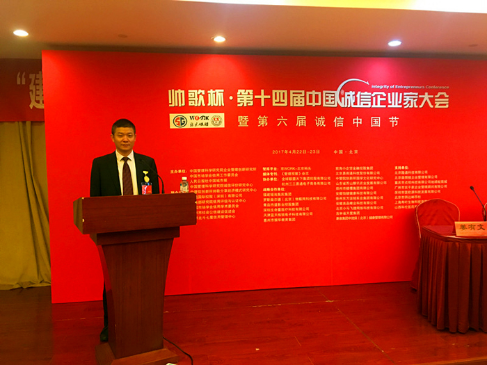 2017年4月22日,第十四屆中國誠信企業(yè)家大會(huì)暨第六屆誠信中國節(jié)在北京人民大會(huì)堂、釣魚臺(tái)國賓館隆重舉辦。本次會(huì)議以“新常態(tài)下誠信建設(shè)與企業(yè)家精神”為主題,安排了經(jīng)濟(jì)學(xué)家特邀報(bào)告會(huì)、誠信建設(shè)大講壇、專題論壇、誠信標(biāo)桿企業(yè)家盛會(huì)、企業(yè)對(duì)接合作洽談等多元活動(dòng)。各有關(guān)領(lǐng)導(dǎo)、專家學(xué)者以及來自全球各地各行業(yè)企業(yè)家、商界精英、媒體等代表千余人,會(huì)議規(guī)模宏大,座無虛席,反響熱烈。